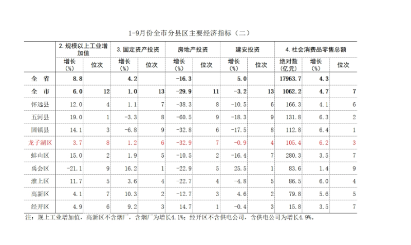 前三季度,规上工业增加值增长3.7%,低于全市平均增速2.3个百分点,居全市第7位;低于全省平均增速5.1个百分点;较上年同期提高4.9个百分点,位次不变。