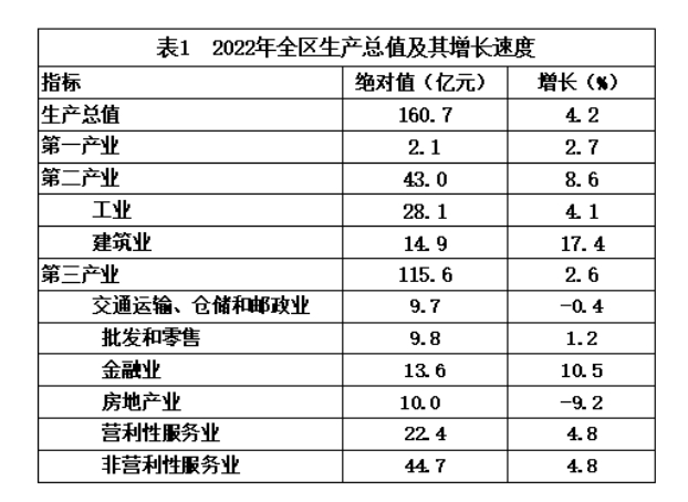 【综合】 初步核算,全年国内生产总值(GDP)160.7亿元,增长4.2%。其中,第一产业增加值2.1亿元,增长2.7%;第二产业增加值43.0亿元,增长8.6%;第三产业增加值115.6亿元,增长2.6%。三产结构由去年的1.7:31.9:66.4调整为1.3:26.8:71.9,其中工业增加值占GDP比重为17.5%。
