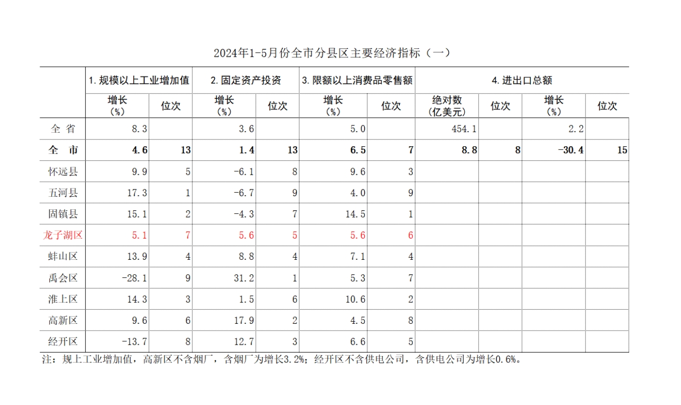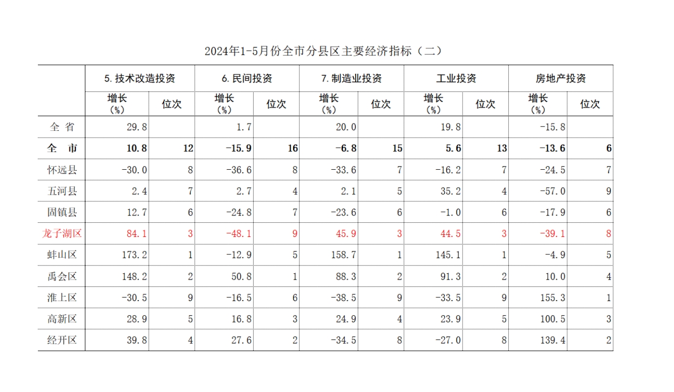 在已经反馈的1-5月10项主要经济指标增速中,我区1-3位的有2个,分别为技术改造投资、制造业投资;4-6位的有2个,分别为固定资产投资、限额以上消费品零售额;7-9位的有3个,分别为规模以上工业增加值、民间投资、一般公共预算收入。