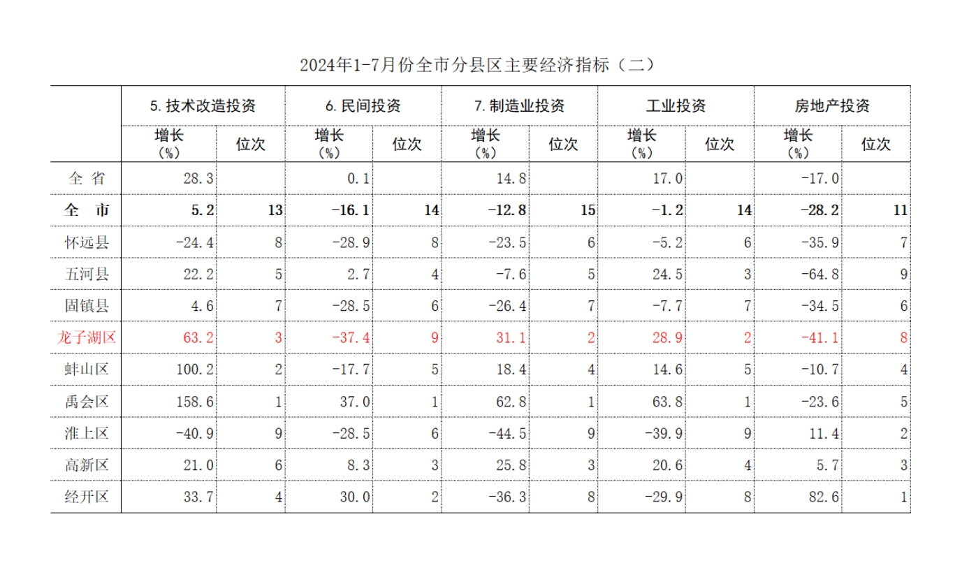 在已经反馈的1-7月10项主要经济指标增速中,我区1-3位的有2个,分别为技术改造投资、制造业投资;4-6位的有3个,分别为固定资产投资、限额以上消费品零售额、一般公共预算收入;7-9位的有2个,分别为规模以上工业增加值、民间投资。