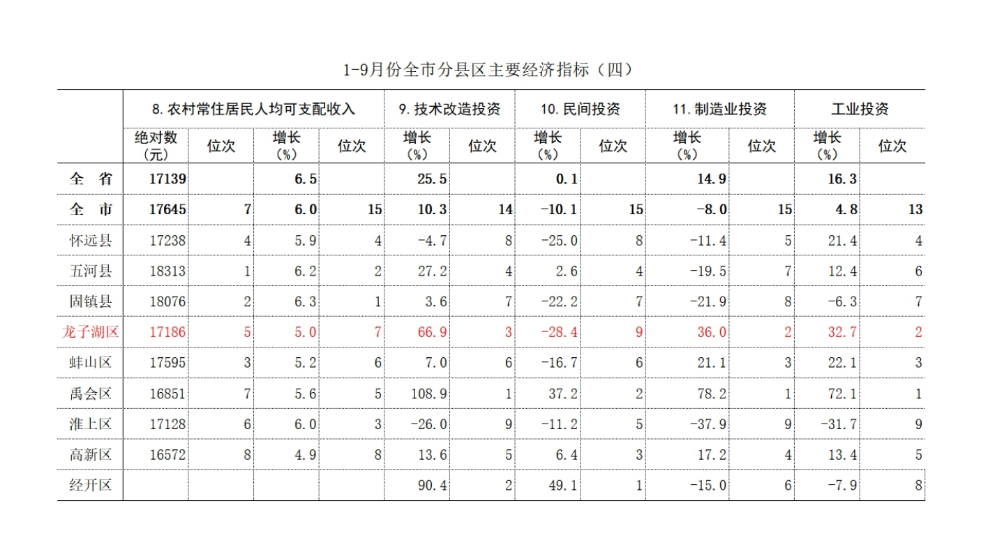 前三季度,农村常住居民人均可支配收入17186元,居全市第5位;增长5.0%,低于全市平均增速1.0个百分点,居全市第7位;低于全省平均增速1.5个百分点;较上年同期降低3.1个百分点,后移6位。