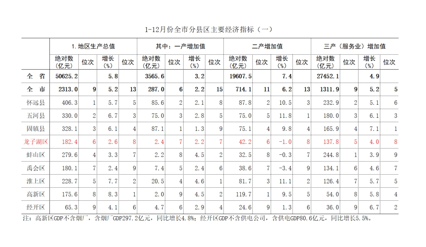 1-12月,GDP完成182.4亿元,居全市第6位;增长2.6%,低于全市平均增速2.6个百分点,居全市第8位;低于全省平均增速3.2个百分点;较上年同期降低2.8个百分点,后移2位。