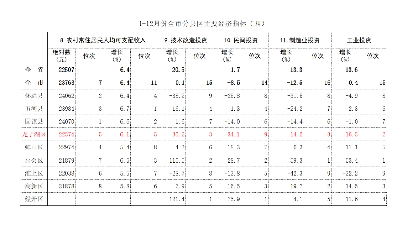 在已经反馈的1-12月14项主要经济指标中,我区增长率排名居全市前三的有3个,分别为社会消费品零售总额、技术改造投资、制造业投资;4-6位的有4个,分别为固定资产投资、城镇常住居民人均可支配收入、农村常住居民人均可支配收入、一般公共预算收入;7-9位的有4个,为地区生产总值、规模以上工业增加值、民间投资、建筑业总产值。