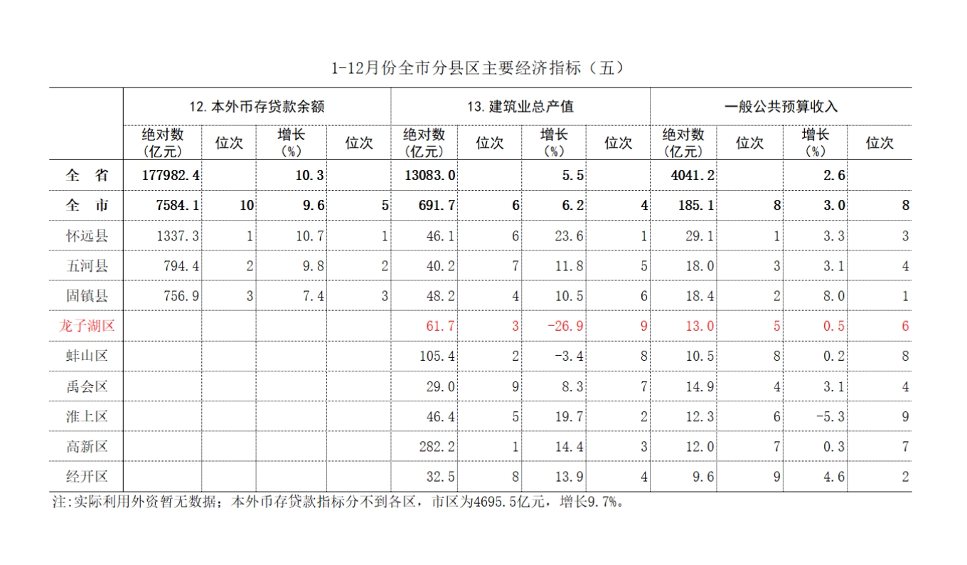 1-12月,一般公共预算收入13.0亿元,居全市第5位;增长0.5%,低于全市平均增速2.5个百分点,居全市第6位;低于全省平均增速2.1个百分点;较上年同期提高3.6个百分点,前移2位。