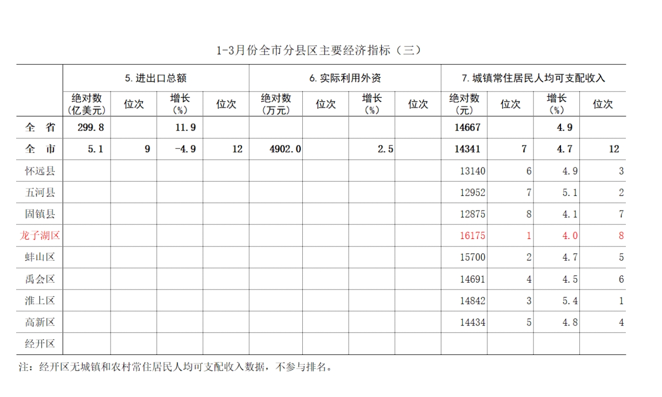 一季度,城镇常住居民人均可支配收入16175元,居全市第1位;增长4.0%,低于全市平均增速0.7个百分点,居全市第8位;低于全省平均增速0.9个百分点;较上年同期降低0.2个百分点,后移5位。