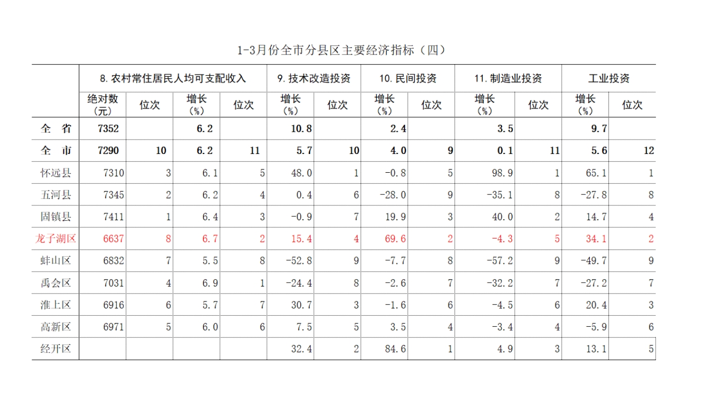 一季度,农村常住居民人均可支配收入6637元,居全市第8位;增长6.7%,高于全市平均增速0.5个百分点,居全市第2位;高于全省平均增速0.5个百分点;较上年同期降低0.2个百分点,前移5位。