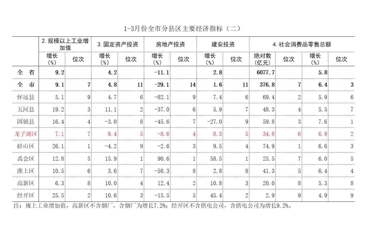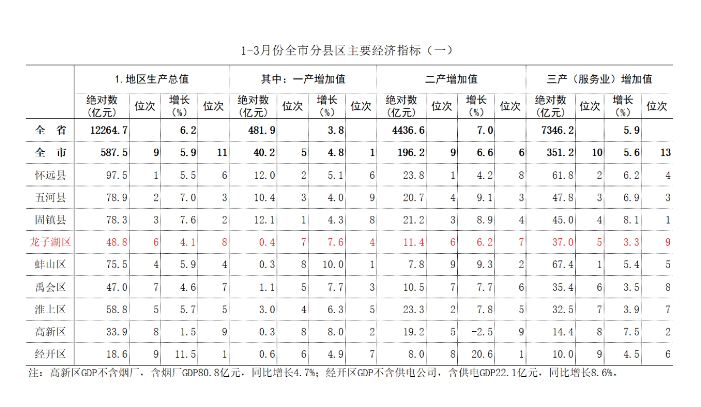 一季度,GDP完成48.8亿元,居全市第6位;增长4.1%,低于全市平均增速1.8个百分点,居全市第8位;低于全省平均增速2.1个百分点;较上年同期降低1.7个百分点,后移3位。