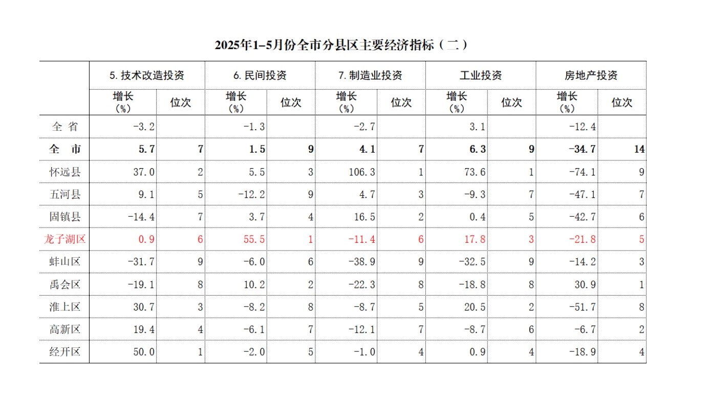 1-5月,固定资产投资增长2.3%,高于全市平均增速0.7个百分点,居全市第6位;高于全省平均增速2.1个百分点;较上年同期降低3.3个百分点,后移1位。