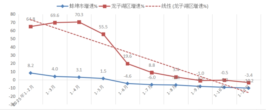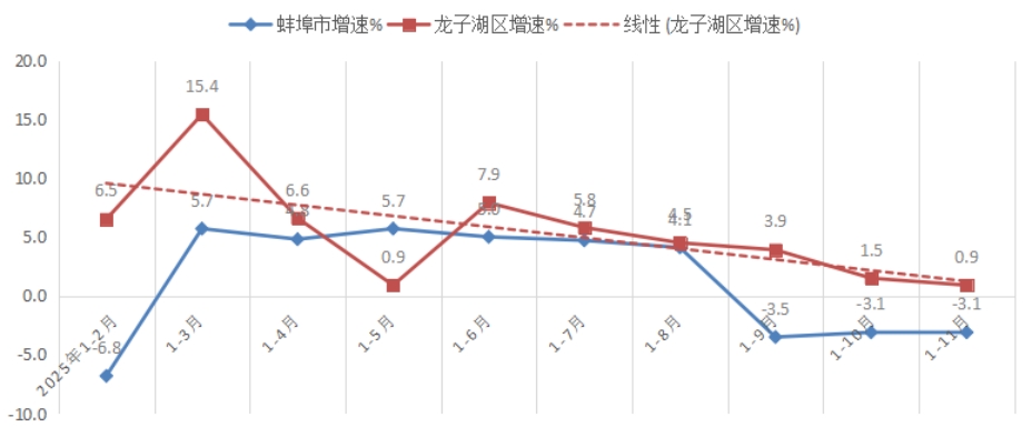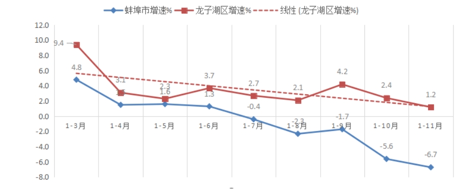 1-11月,规上工业增加值降低1.3%,低于全市平均增速9.9个百分点,居全市第9位;低于全省平均增速10.6个百分点;较上年同期降低3.9个百分点,位次后移2位。