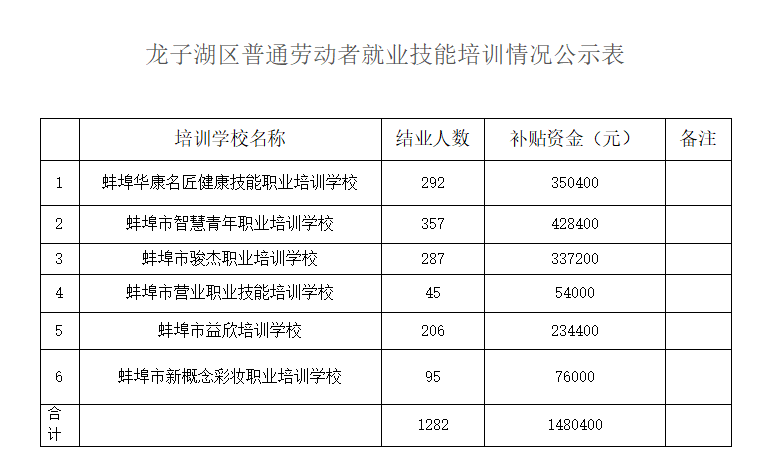 按照省人社厅、财政厅《关于印发安徽省职业技能提升行动实施方案(2019-2021年)政策释义的通知》(皖人社秘〔2019〕278号)、《关于落实疫情防控期间稳定和扩大就业有关政策的通知》(蚌人社发)〔2020〕3号)文件规定,现对2020年第二季度我区开展普通劳动者就业技能培训享受补贴情况进行公示。