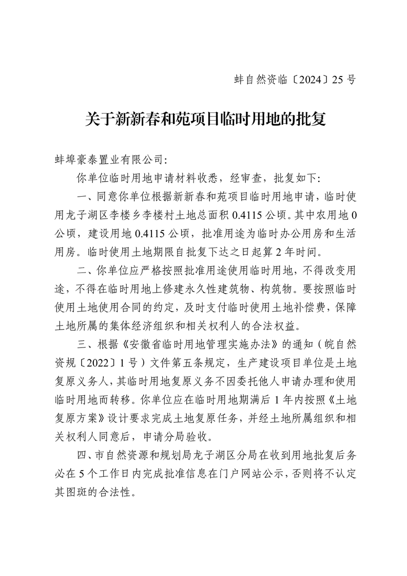 关于新新春和苑项目临时用地的批复_蚌埠市龙子湖区人民政府